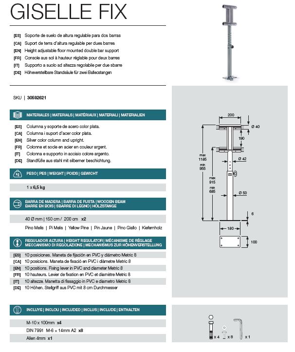 Giselle-Fix je podna šipka s najviše značajki; omogućuje vam stvaranje kontinuiranih prostora s dvostrukim šipkama i podešavanje njihove visine u 10 različitih položaja, prilagođavajući se tako plesačima svih visina. Vrhunski materijali i mala veličina baze omogućuju vam postavljanje baletne šipke blizu zida i više prostora za slobodno vježbanje. Jedinstveni dizajn dvostrukog stalka pruža stabilnost i čvrstoću koja vam je potrebna u vašem studiju. Materijali: Stup i nosač od čelika srebrne boje Težina: 1 x 6,5 kg Drvene šipke: 2 jedinice | Ø: 40 mm | D: 150 cm ili 200 cm | Žuti bor Mehanizam za podešavanje: 10 visina. PVC gumb za regulaciju visine i metrički promjer 8 Alati i vijci: M-10 x 100 mm x4 DIN 7991 M-6 × 14 mm A2 x 8 Allen 4 mm x1