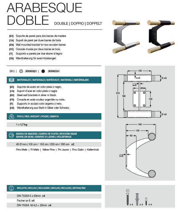Dvostruki nosači Arabesque dizajnirani su tako da mogu spojiti četiri šipke, dvije drvene šipke u svakom cilindru. To omogućuje montažu kontinuirane dvostruke baletne šipke u sobama, iskorištavajući sve prostore i održavajući potpunu stabilnost u svim točkama.