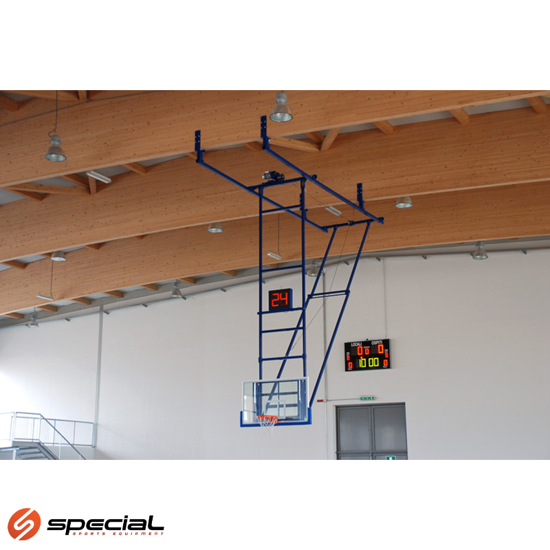 Košarkaška konstrukcija stropna, sklopiva izrađena prema nacrtu. Elektrificirana, komplet sa sigurnosnom kočnicom. Košarkaška ploča sekurit sa okvirom i mekanom zaštitom dimenzija 1800x1050 mm. Košarkaški obruč zglobni komplet sa mrežicom. Homologirana FIBA 2° i 3°level.