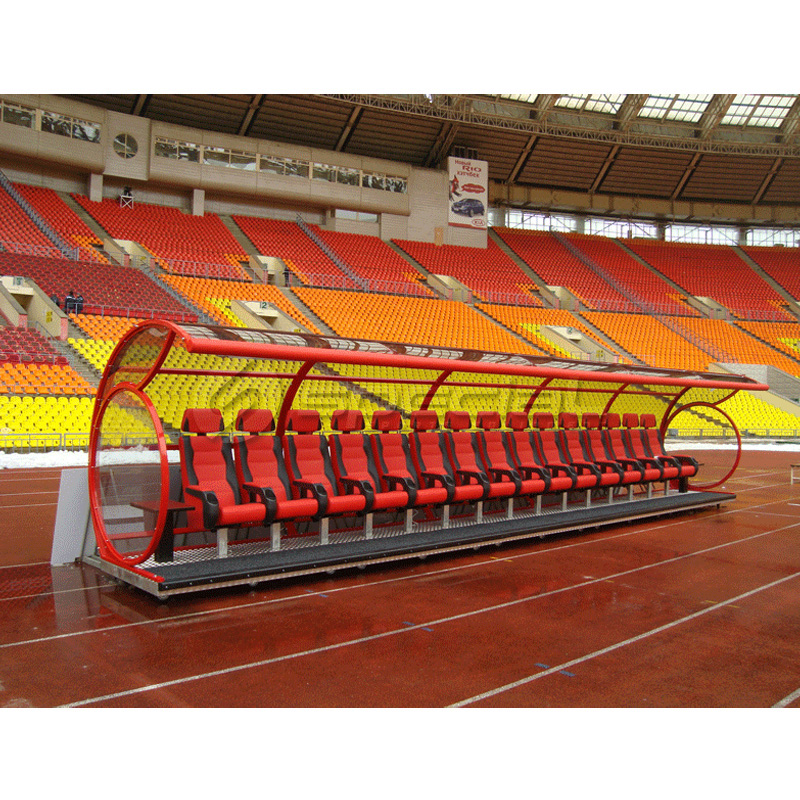 Klupa za rezervne igrače, mobilna na kotačima, rađena po mjeri. Konstrukcija metalna pocinčana, sa dijelovima i od aluminija. Prekrivena zatamnjenim polikarbonatom 3 mm sa mekanom zaštitom. Fotelje presvučene eko kožom sa mogućnošću personalizacije.