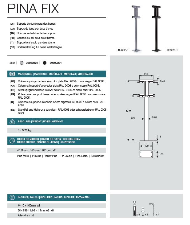 Pina-Fix držači za dvije drvene prečke, postavljene na razmak od 19 cm, omogućuju plesačima različitih visina istovremeno korištenje prečke. Dizajn, do najsitnijih detalja, nudi stabilnost za vježbanje i mogućnost stvaranja prostora koji su ne samo lijepi već i vrlo funkcionalni. Materijali: Stup i nosač od čelika, srebrne RAL 9006 ili crne RAL 9005 boje Težina: 1 x 5,75 kg Drvene prečke: 2 jedinice | Ø: 40 mm | D: 150 cm ili 200 cm | Žuti bor Alati i vijci: M-10 x 100 mm x4 DIN 7991 M-6 × 14 mm A2 x 8 Allen 4 mm x1