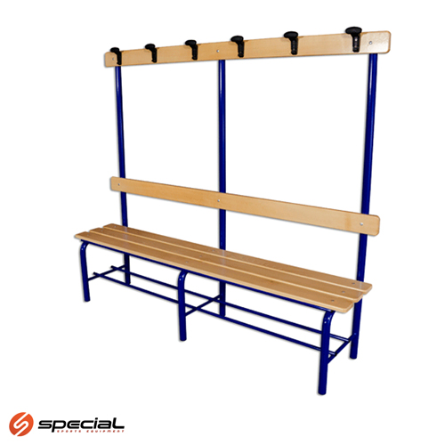 Klupa za svlačionice sa naslonom i vješalicom 2 m. Metalna konstrukcija sa sjedištem od drvenih lajsni, dimenzija 200x40x185 cm